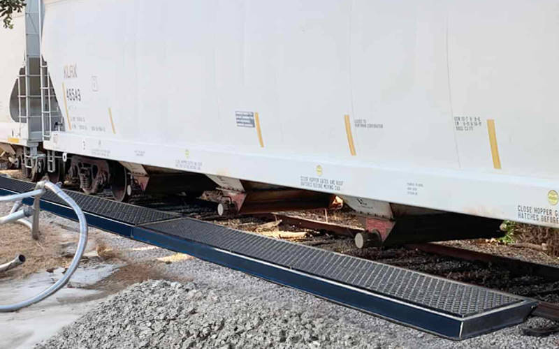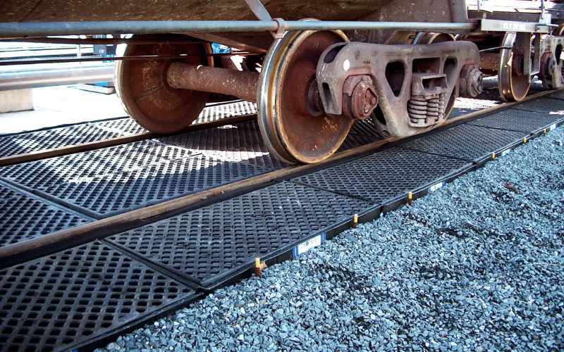 Railroads and terminals handling plastic pellets and other bulk solids use rail pellet pans and rail mats to keep materials out of ballast and storm drains. These systems capture pellets and small spills at loadout points and under transfer equipment for easier cleanup and compliance.
